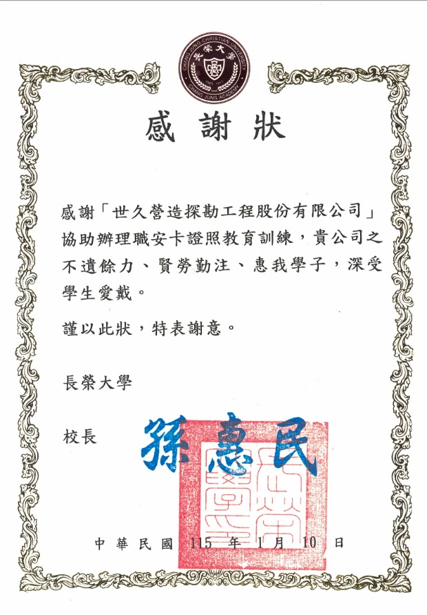 Our company has been awarded a certificate of appreciation from Chang Jung Christian University in recognition of our support for occupational safety education and training.